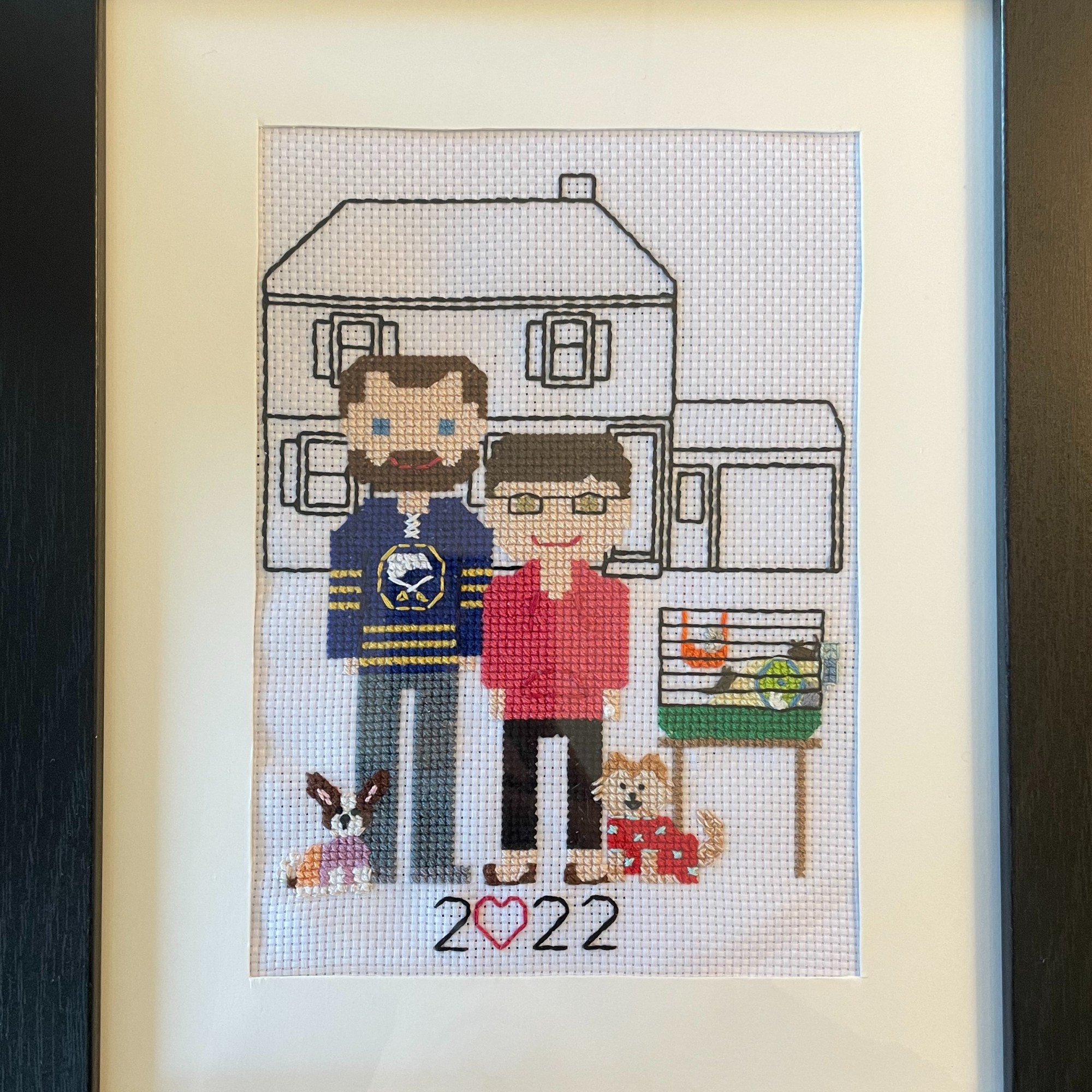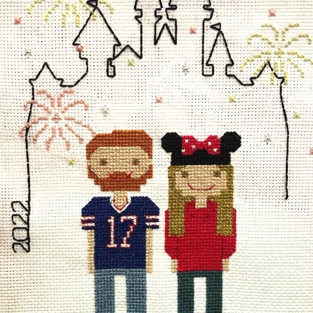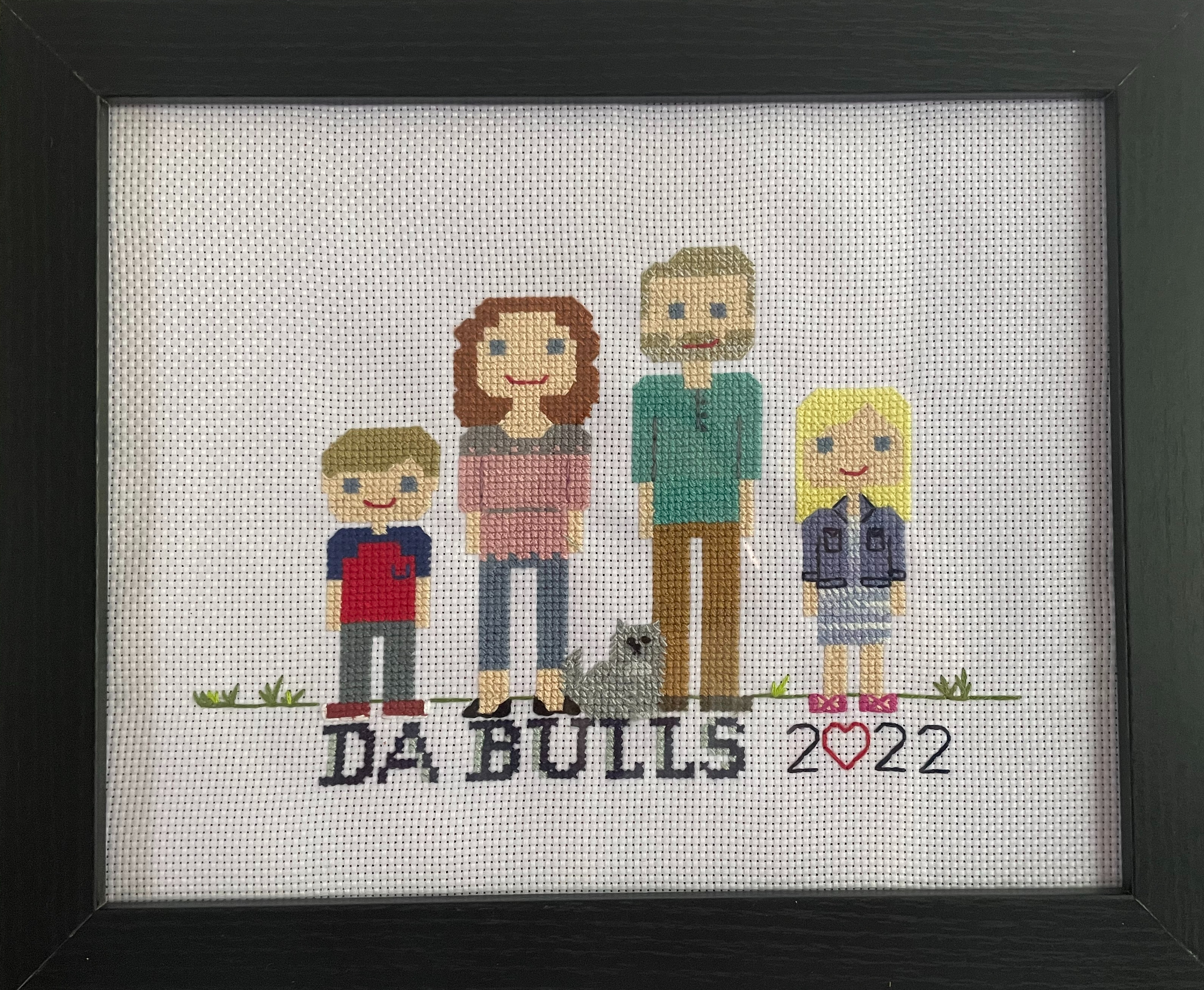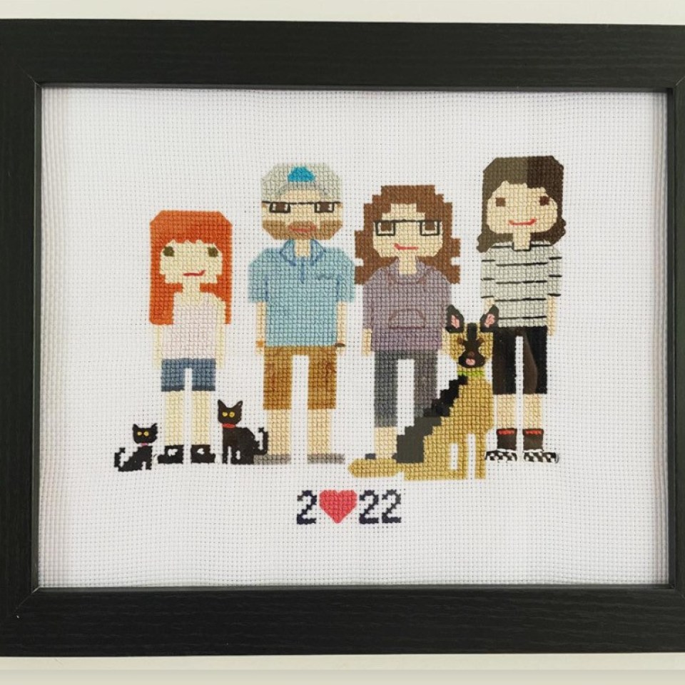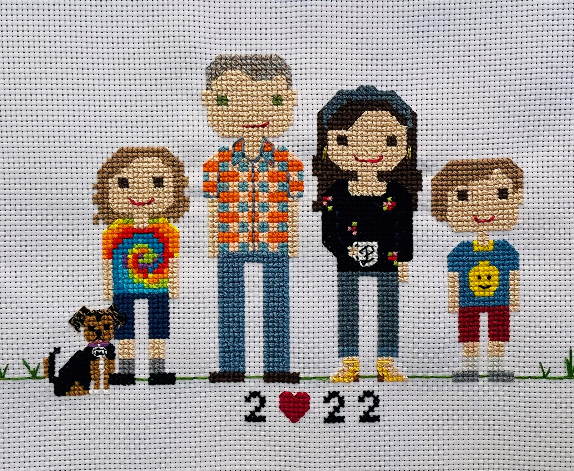 We use an interactive process for designing your piece. We will ask you to complete a survey providing details of your characters (e.g., features, favorite colors, hobbies, etc.) and ask for a few photos. Next, you will receive a hand-drawn design of the piece to review and suggest changes. Stitching will not begin until you are completely satisfied with the design. Upon approval, the artist will provide an estimated timetable for completion (typically 3-6 weeks) and an initial quoted price. Price varies based on the number of characters and details.