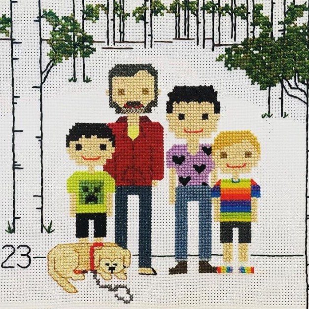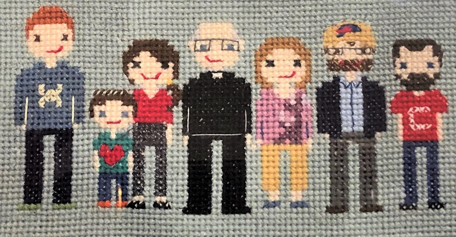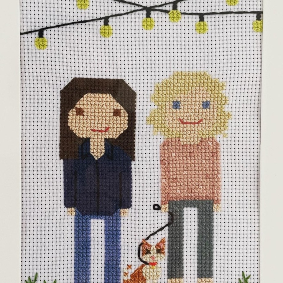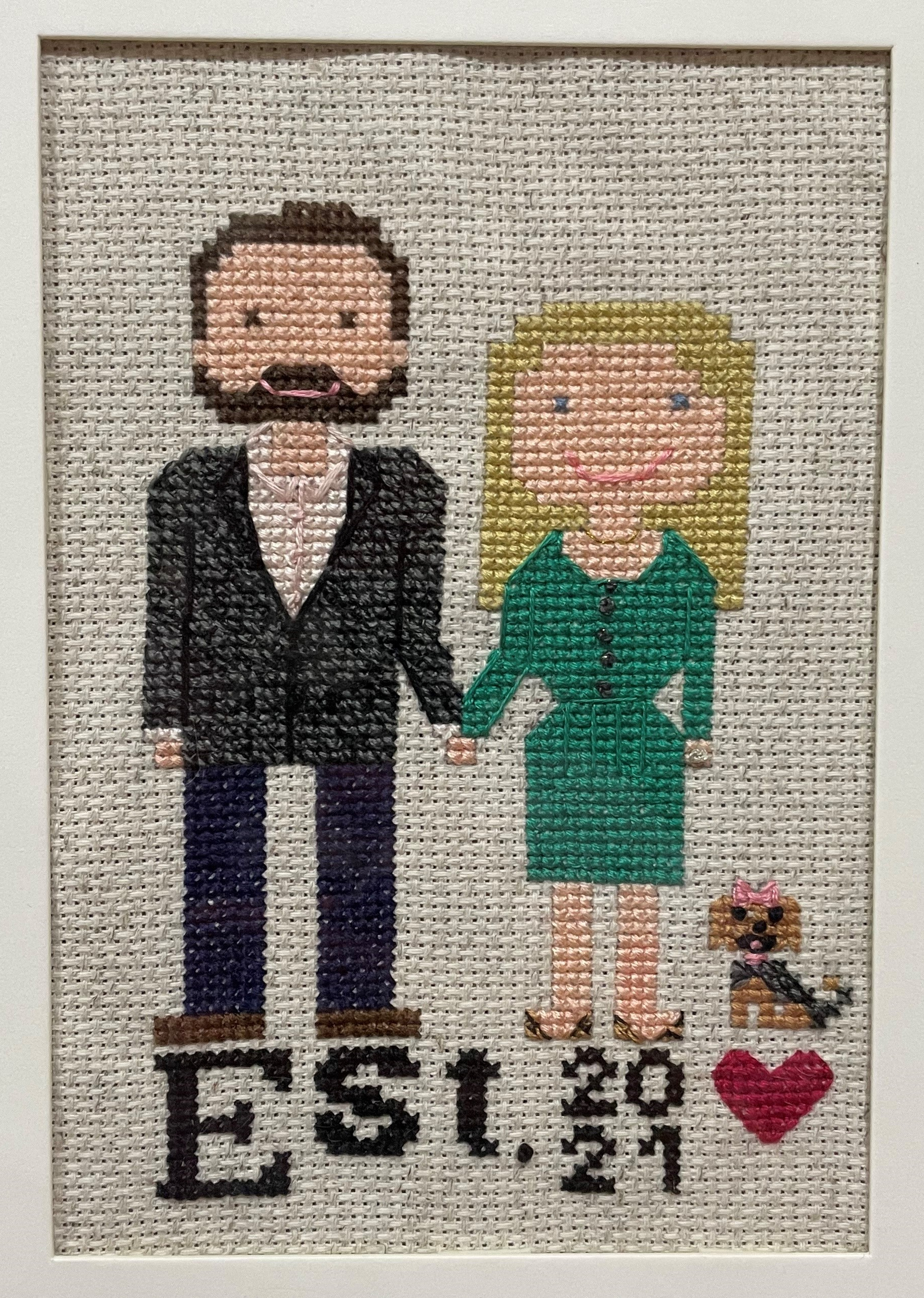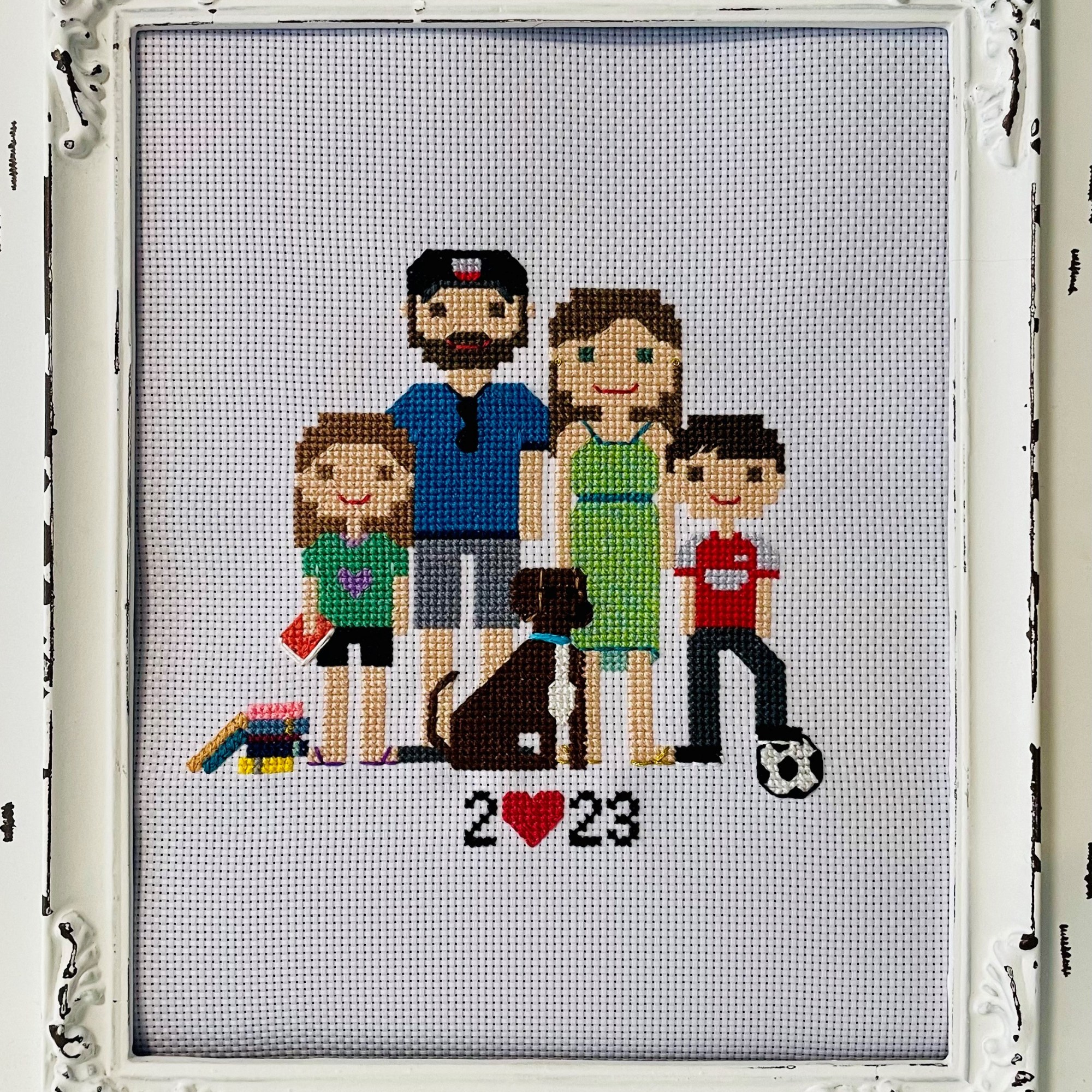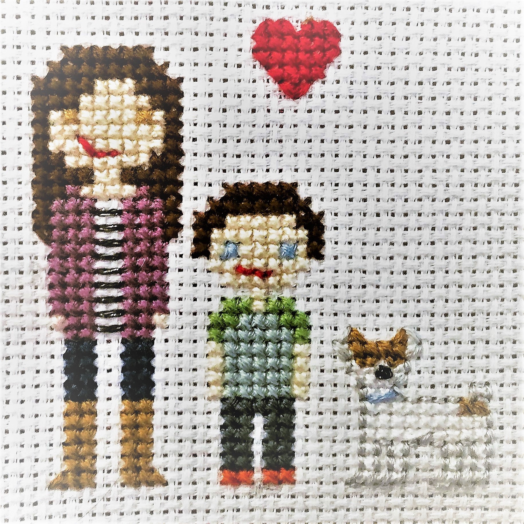 We use an interactive process for designing your piece. We will ask you to complete a survey providing details of your characters (e.g., features, favorite colors, hobbies, etc.) and ask for a few photos. Next, you will receive a hand-drawn design of the piece to review and suggest changes. Stitching will not begin until you are completely satisfied with the design. Upon approval, the artist will provide an estimated timetable for completion (typically 3-6 weeks) and an initial quoted price. Price varies based on the number of characters and details.